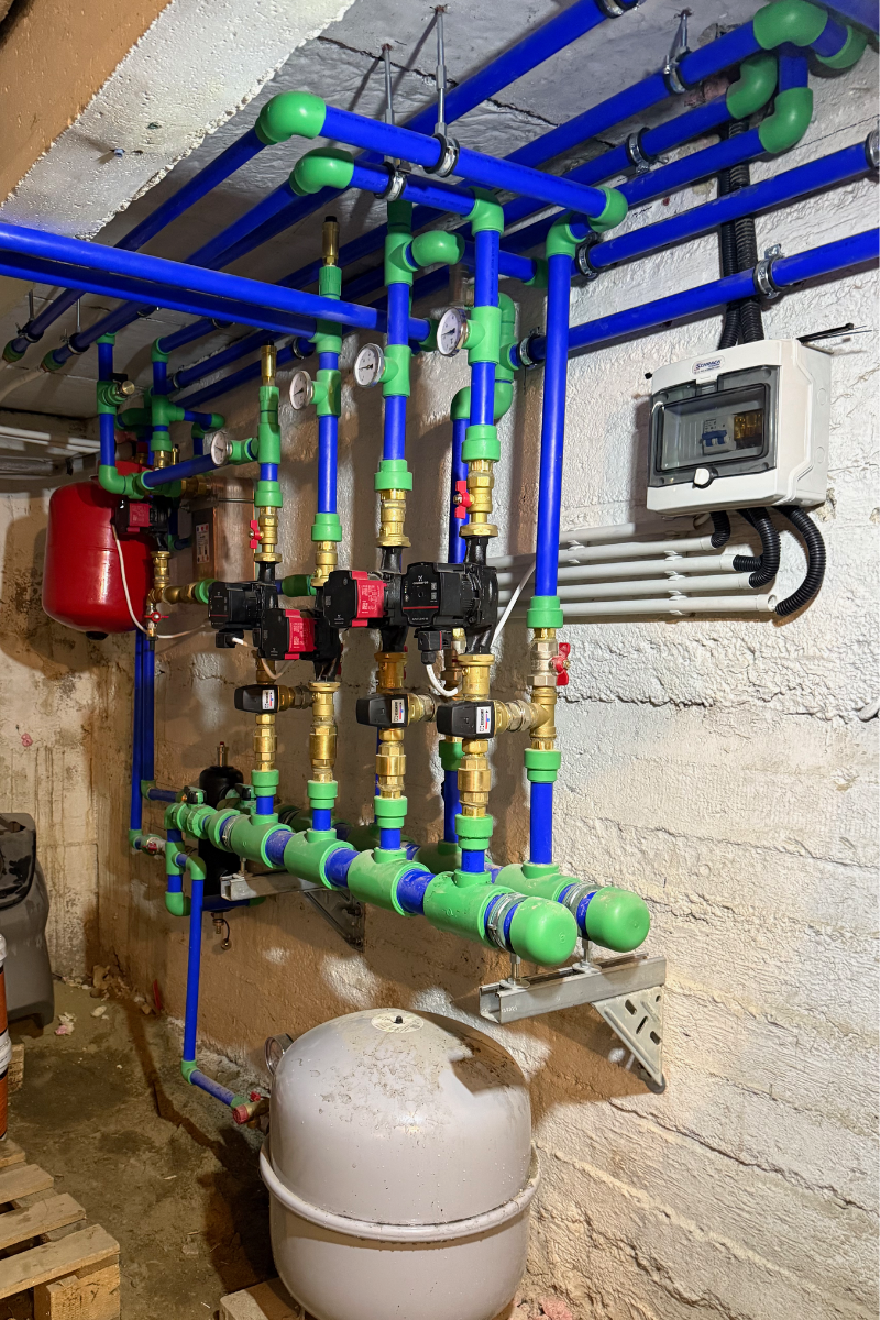 Gyakori kihívás felújításkor a szűkös hely. Itt látható, hogyan fér el egy komplett fűtési-hűtési központ mindössze 1 négyzetméteren. Átgondolt csővezetés, logikus elrendezés és könnyű hozzáférhetőség a karbantartáshoz – felesleges térveszteség nélkül.